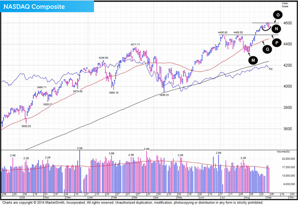 When we looked at the market Saturday 30th August 2014, we noticed that since the NASDAQ Composite shook out all the weak hands on August 7th (Point J), we’d had twelve up days and only four down days. This action was a clear confirmation that a new uptrend had begun.